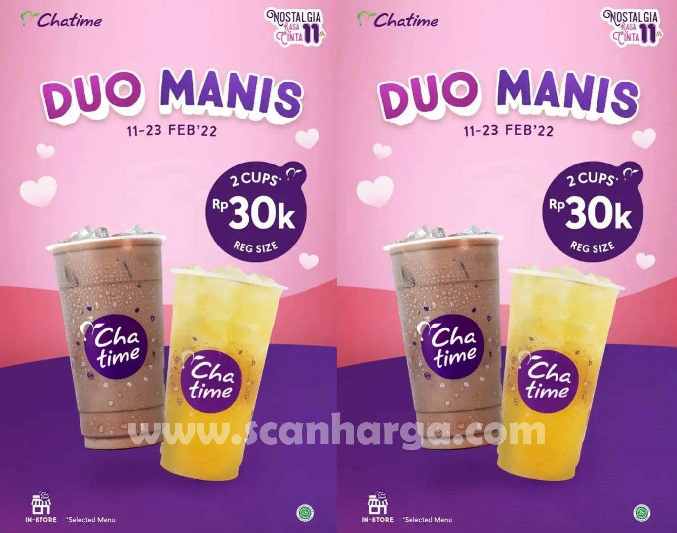 Promo CHATIME DUO MANIS - Harga Spesial 2 Cup Hanya Rp. 30rb* Periode promosi berlaku hingga 23 Februari 2022.