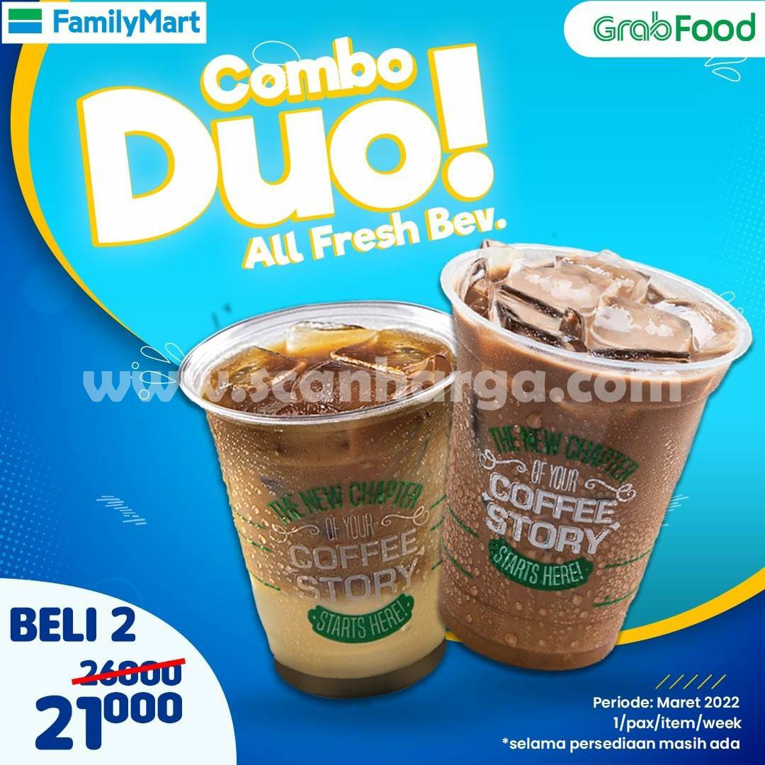 FAMILYMART Promo COMBO DUO – Beli 2 Minuman mulai Rp 21.000 khusus pemesanan via GRABFOOD. Periode promosi berlaku sepanjang bulan Maret 2022.